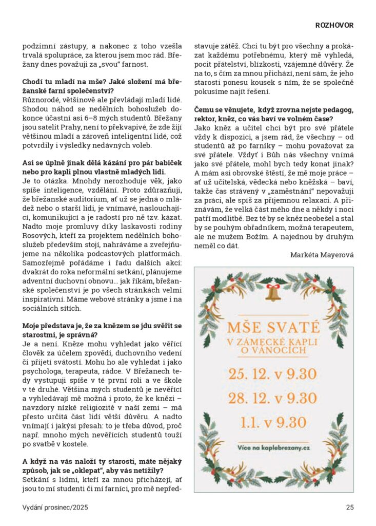 Rozhovor s P. Vladimírem v obecním časopisu Rozhled by Jan Rosa | Dec 18, 2025 | Uncategorized | 0 comments Náš P. Vladimír poskytl v aktuální čísle obecního zpravodaje Dolních Břežan rozhovor. Zde je 🙂 Submit a Comment Cancel replyYour email address will not be published. Required fields are marked *Comment * Name * Email * Website Save my name, email, and website in this browser for the next time I comment.